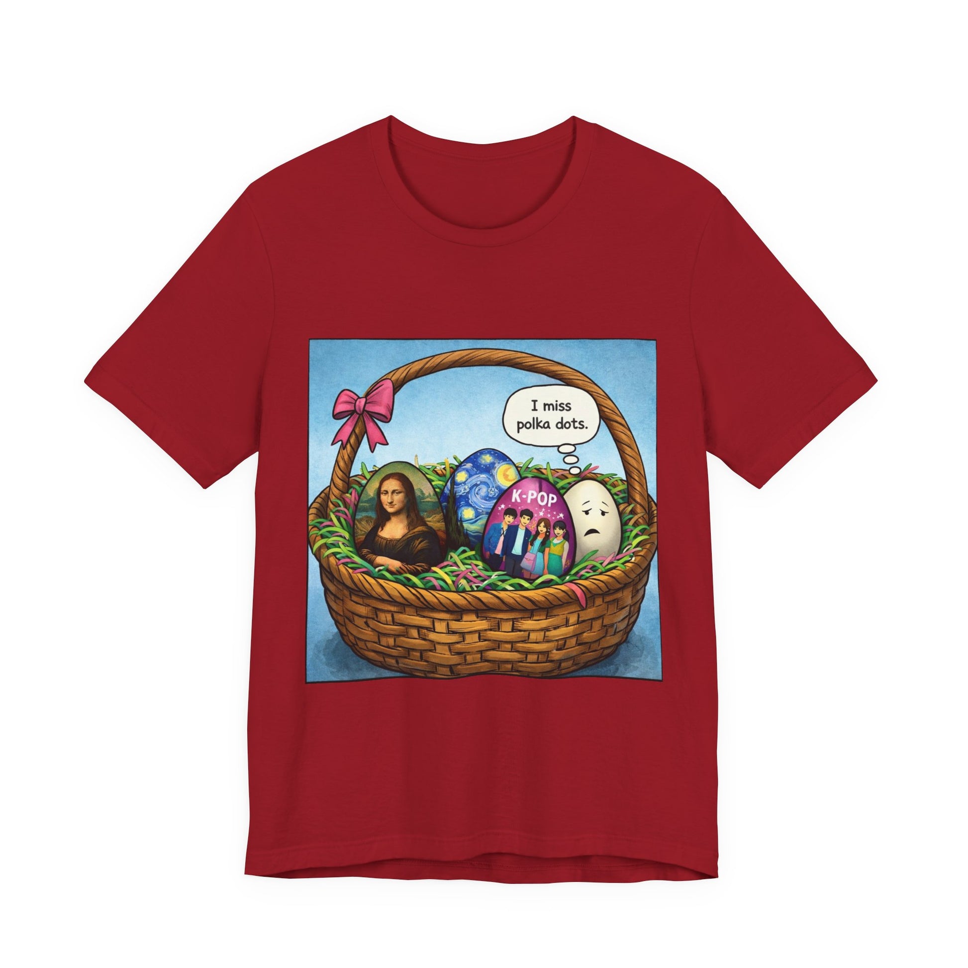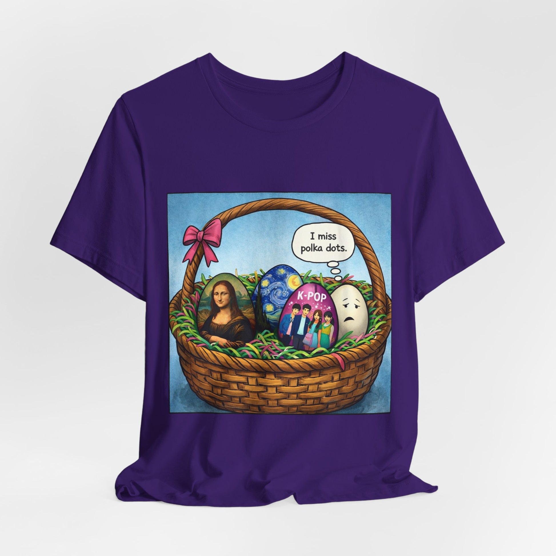 A soft, breathable tee that blends everyday comfort with playful, artful humor. The lightweight Airlume combed and ring-spun cotton feels gentle against skin and breathes easily whether you’re layering or wearing it solo. The front features a whimsical illustrated basket of decorated eggs — including a mini Mona Lisa, an emotive ghost, and a K-pop–themed egg — with a speech bubble that reads “I miss polka dots.” That unexpected mix of pop-culture nods and clever visual gag makes this shirt a conversation starter in casual settings or relaxed creative meetups. The retail crew neckline and clean side seams give it a tidy silhouette that sits well with jeans, skirts, or under an open flannel. Thoughtfully made with shoulder tape, a ribbed collar, and a tear-away label for reduced irritation. Ethically produced by a brand committed to fair labor standards and REACH compliance.